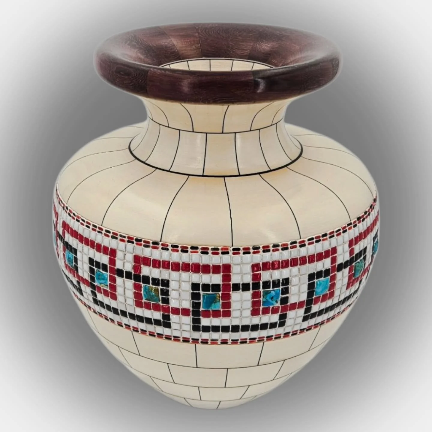 View fullsize TileWorks, cont. A segmented vase made from Holly, Katalox, veneers and ceramic (micro) tiles. Approximately 8" x 10". More: See links in bio.