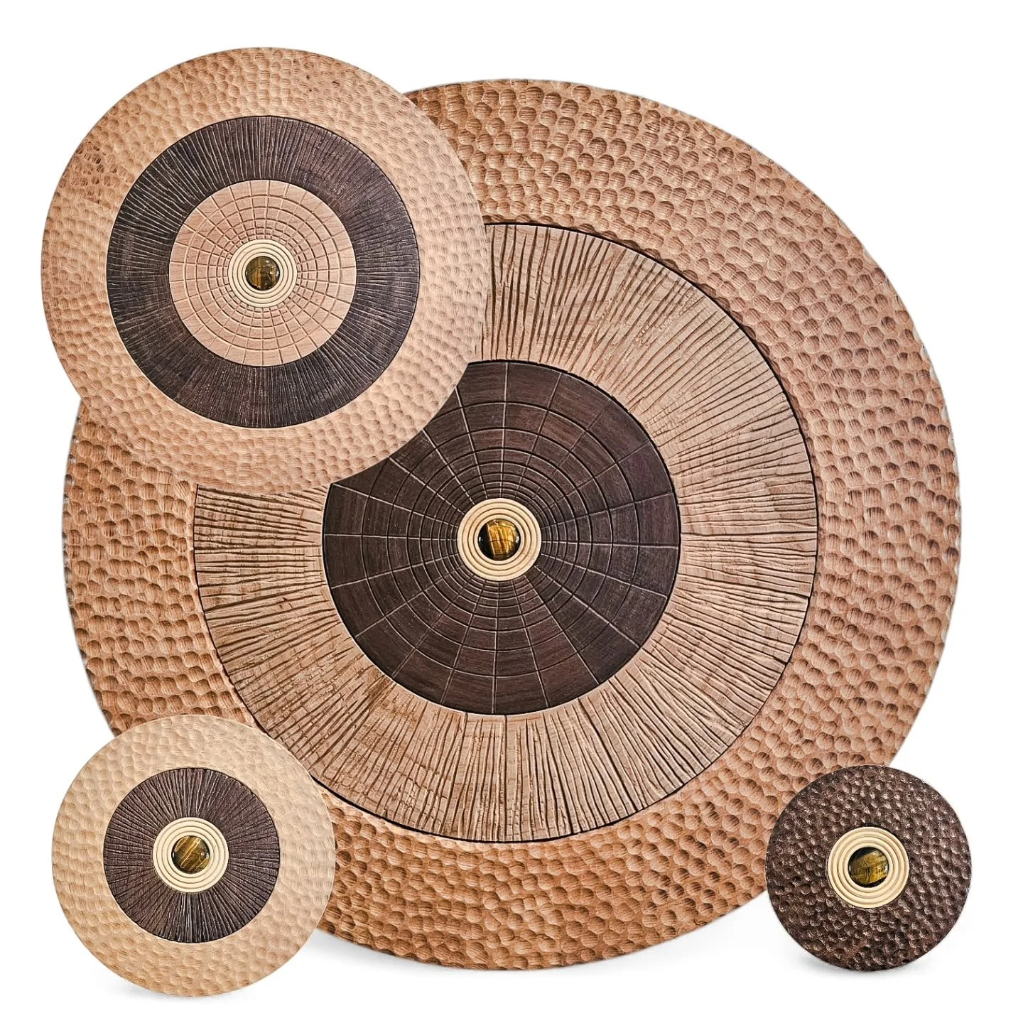 View fullsize The first project of 2026: A set of four wall sculptures, made from Holly, Peruvian Walnut, Cherry, and Alder, with Tiger Eye in the centers. The sizes are 6", 9", 15", and 25". More: See links in bio.