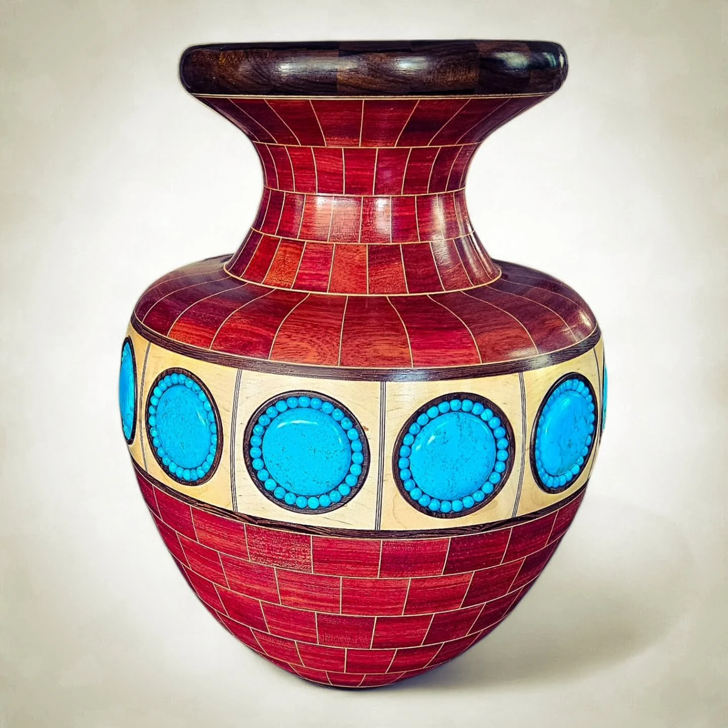 View fullsize LG Segmented Vase. Bloodwood, Ziricote, Maple, misc. veneers and Turquoise-blue Howlite. Approximately 12" x 16". More: See links in bio.