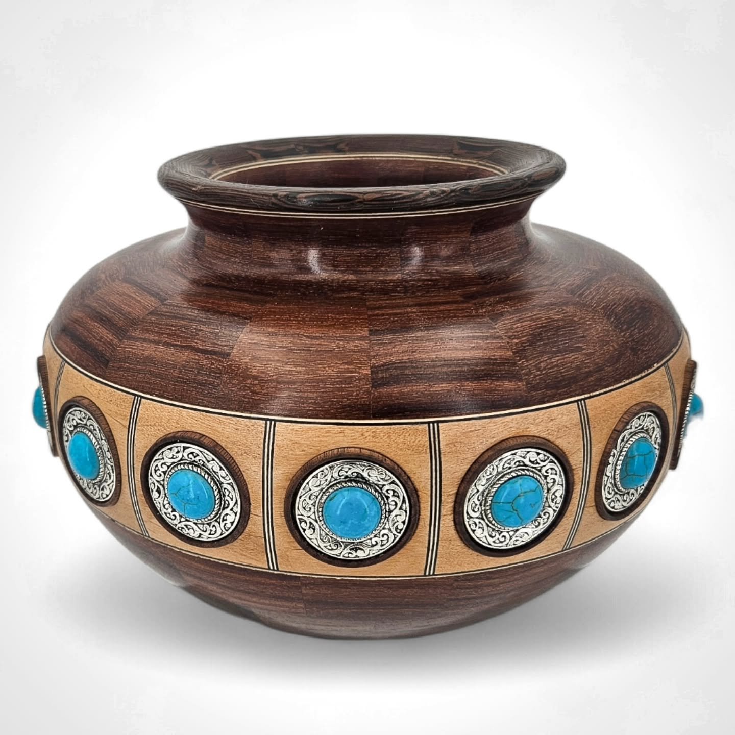 View fullsize A Segmented Vessel with Stone Inlay. This one was made from Granadillo, Ziricote, Alder, some veneers, and Turquoise set in Pewter. Approximately 8" x 5.5". More: See links in bio.
