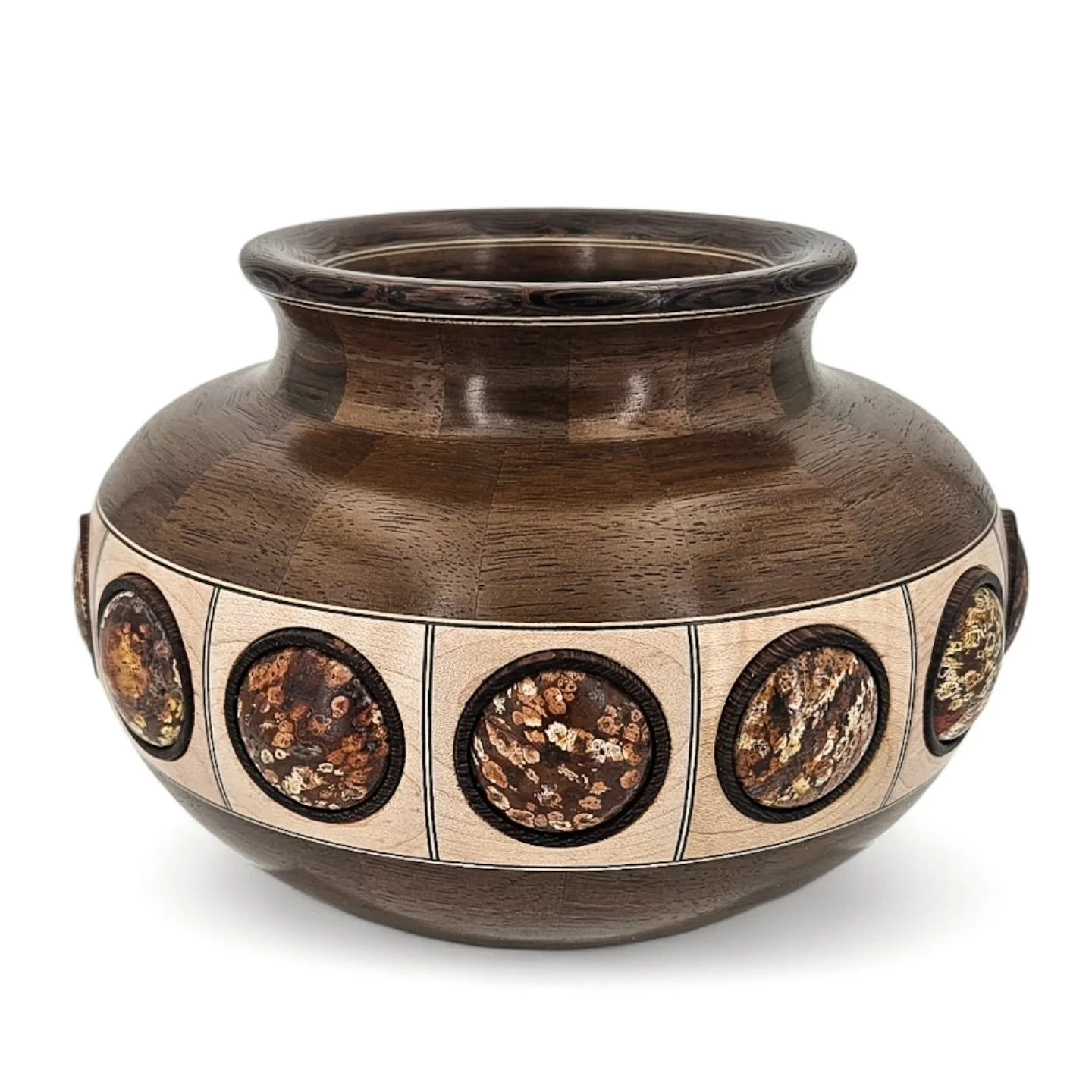 View fullsize A Segmented Vessel with Stone Inlay.  Peruvian Walnut, Wenge, Maple, and veneers. With Lepard Skin Agate. Approximately 7.5" x 5.5". More: See links in bio.
